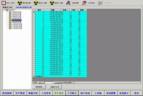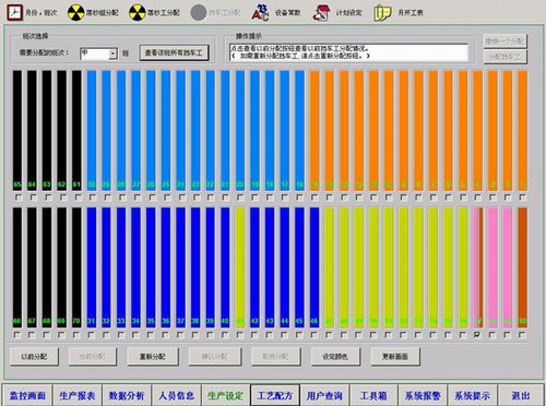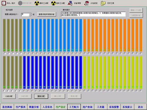 4.生產設定部分生產設定包括:系統班次運轉、早中夜三班的上班時間、生產月的起止、各班落紗組區域分配、各班落紗工所負責的車臺分配、各班擋車工所負責的車臺分配、設備常數的設定、當前各車臺生產支別的設定、計劃設定、月開工表設定。系統班次運轉設定: 各班落紗組區域分配:一種顏色代表一個落紗組 各班各擋車工區域設定:一種顏色代表一個區域 各車臺生產支別設定:一種顏色代表一種支別