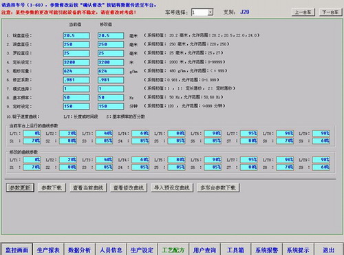 5、工藝配方部分:工藝配方部分主要處理所有車的參數上下載及保存工藝。界面如下(帶變頻:1-30號車):