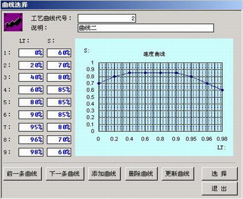LT-S曲線界面: 用戶可以預先編輯幾條工藝曲線并保存到工藝庫中,需要時可以從工藝曲線庫導入并下載到某臺車。曲線導入界面: