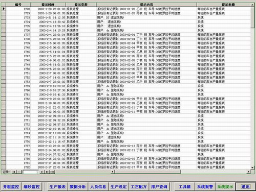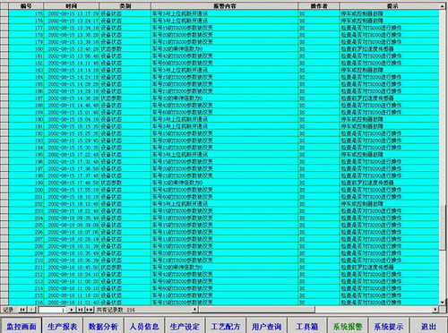 7.系統報警部分:系統報警部分負責對所有車臺的運行狀態的報警。主要包括:緊急剎車、TD200參數改變、與上位機的通訊狀態、車臺上反映的班次與上位機所處的班次比較、錠子速度、羅拉速度、牽伸倍數等報警。界面如下圖: