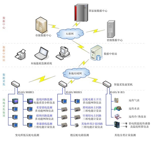 Acrel-5000建筑能耗分析管理系統(tǒng)是上海安科瑞電氣股份有限公司針對(duì)建筑能耗開(kāi)發(fā)的軟件平臺(tái),以計(jì)算機(jī)、通訊設(shè)備、測(cè)控單元為基本工具,根據(jù)現(xiàn)場(chǎng)實(shí)際情況采用現(xiàn)場(chǎng)總線、光纖環(huán)網(wǎng)或無(wú)線通訊中的一種或多種結(jié)合的最優(yōu)化的組網(wǎng)方式,為大型公共建筑的實(shí)時(shí)數(shù)據(jù)采集及遠(yuǎn)程管理與控制提供了基礎(chǔ)平臺(tái),它可以和檢測(cè)設(shè)備構(gòu)成任意復(fù)雜的監(jiān)控系統(tǒng)。開(kāi)放性、網(wǎng)絡(luò)化、單元化、組態(tài)化的采用面向?qū)ο蟮姆謱、分?jí)、分布式智能一體化結(jié)構(gòu)。系統(tǒng)基于對(duì)114號(hào)文件的充分理解,建立如下層次結(jié)構(gòu):