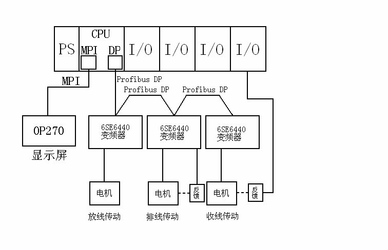 本系統采用西門子S7-300可編程控制器進行邏輯運算,并根據設定的參數和采樣得到的數據經過CPU運算,得到了放線、收線和排線的參考速度,再通過Profibus-DP方式實時地傳送給變頻器。同時,經過計算的放線、收線和排線的參考速度及班產量等通過MPI方式實時的傳送給顯示屏。顯示屏不僅用于顯示各個傳動軸的系統參數及產量等,還可以設定收線的棍子直徑、線徑及棍子的寬度等與控制有關的計算用數據。