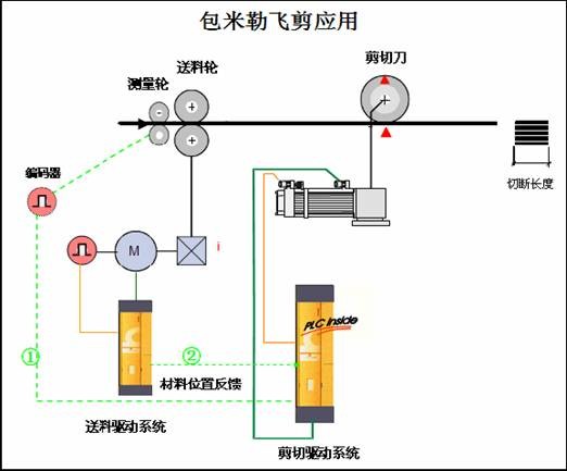 圖1 為包米勒飛剪應用的系統構成。其送料單元由送料驅動系統控制,負責平穩無打滑的送料;剪切單元由剪切伺服系統控制,它根據設定的切斷長度和送料的速度,驅動剪切刀對鋼筋進行定長剪切。伺服系統控制參數如切斷長度、送料速度等由人機界面輸入;材料的速度和位置由編碼器反饋到剪切驅動系統。編碼器信號來源分為被動式和主動式: