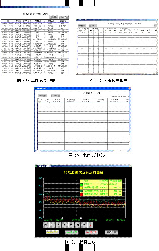 報表統計功能:主要完成對進線回路的事件記錄報表(見圖(3 ));遠程抄表(見圖(4 ))以及用電統計報表統計(見圖(5 )),支持時間查詢及報表打印輸出。
