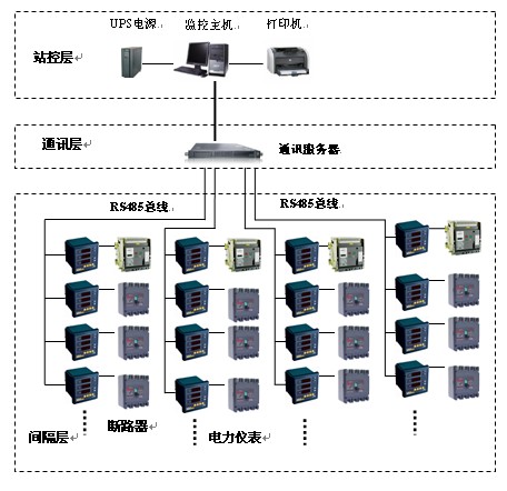 間隔層主要的設備為:多功能網絡電力儀表、開關量、模擬量采集模塊和智能斷路器等。這些裝置分別對應相應的一次設備安裝在電氣柜內,這些裝置均采用RS485 通訊接口,通過現場MODBUS 總線組網通訊,實現數據現場采集。