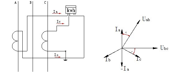 正確接線時(shí)的有功功率為:P=Pa+ Pc =UabIa.cos(30°+φa)+ Ucb.Ic.cos(30°-φc);三相電路平衡時(shí),Uab=Ucb=√3U,Ia=Ic=√3I,即,P=3UI cosφ;假如A相電流互感器極性接反,祥見(jiàn)接線圖(a)和相量圖(b)