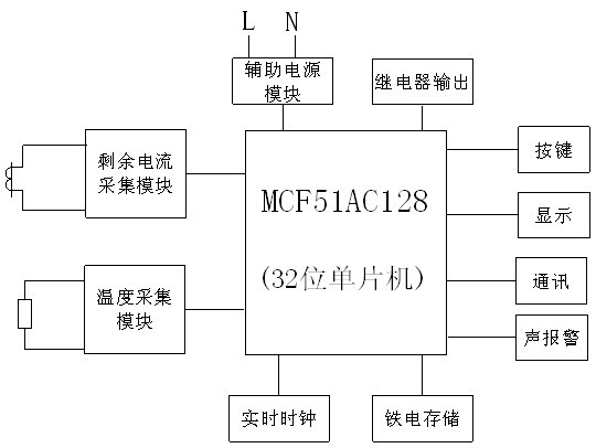 剩余電流互感器將感應出來的信號傳輸到剩余電流采集模塊,經過信號的轉換濾波后MCU利用片內AD模塊對各個通道的信號量進行AD采樣,并進行相應的數學運算,完成信號的精確測量,再按設置的保護參數,進行報警保護處理。同時MCU根據探測器的狀態,來控制LED數碼管顯示、數據計算\存儲、外部通訊、鍵盤菜單操作、繼電器開關動作、蜂鳴器報警等工作。