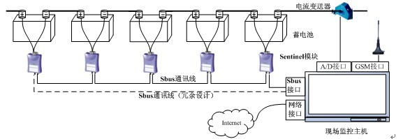 蓄電池在線監(jiān)測系統(tǒng)一方面需要完成在工業(yè)現(xiàn)場如變電站,數(shù)據(jù)中心等場合蓄電池參數(shù)的人機(jī)交互,方便用戶在現(xiàn)場時觀測蓄電池組整體電壓,電流以及各單體電池的阻抗,電壓和溫度;另一方面需要提供網(wǎng)絡(luò)接口,使用戶在遠(yuǎn)端如中央控制室能夠及時了解現(xiàn)場的情況;最后需增加GSM接口,一旦發(fā)生故障,可以用發(fā)短信或者打電話的方式通知到值班人員。因此有必要設(shè)計(jì)一臺現(xiàn)場監(jiān)測主機(jī)完成以上功能,與Sentinel模塊相配實(shí)現(xiàn)整個蓄電池在線監(jiān)測系統(tǒng)的構(gòu)建,如下圖: