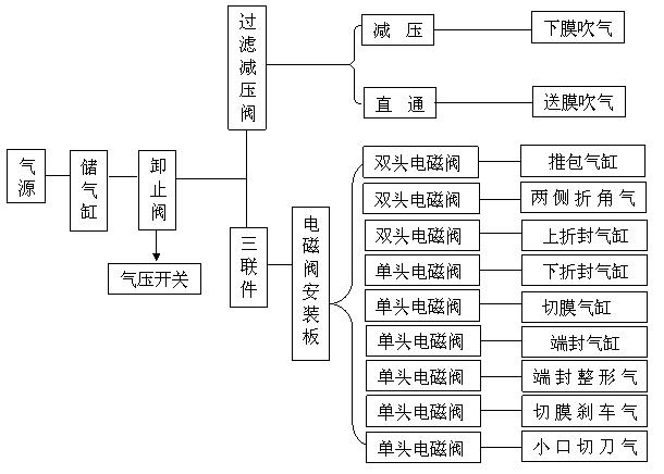 控制系統的控制有3種工作方式:1)手動操作;2)單動操作;3)自動連續操作。氣動部件控制框圖如圖3 所示。以下對控制系統手動操作方式考慮作簡要說明,單動操作和自動連續操作與手動操作方式類似,不再多敘。 當手動操作時,推料、折角、整形、上折封、下折封、易拉線、下膜、切斷、吹氣都能獨立動作,其中: 推料:推料—〉推到位—〉推料停—〉推料回—〉推料回到位—〉推料回停 折角:折角—〉折角折到位—〉折角停 折角回—〉折角回到位—〉折角回停 整形:整形—〉整形開始延時—〉時間到—〉整形退 上折封:上折封向下—〉上折封下到位—〉上折封向下停 上折封向上—〉上折封上到位—〉上折封向上停 下折封:下折封向上—〉下折封上到位—〉下折封向上停 下折封向下—〉下折封下到位—〉下折封向下停 易拉線:易拉線動作—〉易拉線動作延時—〉時間到—〉復位 下膜:下膜—〉伺服動作—〉下膜到設定長度后停止 吹氣動作—〉定時—〉定時到—〉停 切斷:單獨點動 吹氣:吹氣動作—〉定時—〉定時到—〉停 在自動運行的狀態下,系統會自動進行計算,然后在人機上顯示。 4.系統保護及安全措施