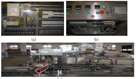 2.系統構成: LS-300L型包裝機所有機構全部采用氣動組件,全部采用氣動控制,在同行業同類型產品中屬于中高檔機種。該包裝機對于各種形狀、大小的包裝盒都能包裝塑料膜,只需通過控制系統的人機界面對輸送軌道的寬度、包裝膜的長寬、折角整形的寬度等進行調整就能夠進行包裝。系統主要采用臺達工控產品DOP-A57CSTD,DVP-32EH00T,ASD-A0421LA,ASMT04L250AK,DTA4848等構成系統,包裝機控制系統運行現場如圖2(a)、圖2(b)和圖2(c)所示。