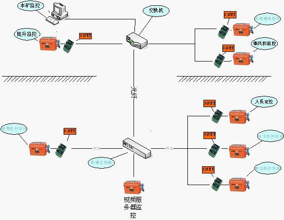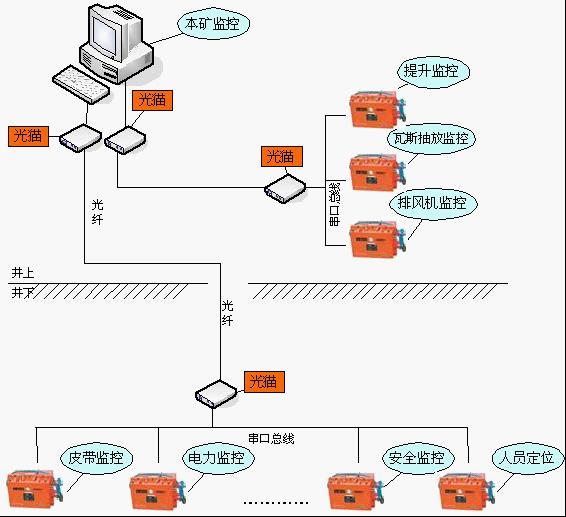 傳統(tǒng)礦井監(jiān)控系統(tǒng)大多采用的是點(diǎn)對點(diǎn)的通信方式,兩端分別由一個(gè)光貓轉(zhuǎn)換器(RS485-光纖和光纖-RS232)轉(zhuǎn)光纖進(jìn)行通信。煤炭企業(yè)的信息化分為安全生產(chǎn)信息化和管理信息化兩部分。整個(gè)系統(tǒng)由本礦控制中心、提升監(jiān)控、瓦斯抽放監(jiān)控、風(fēng)機(jī)監(jiān)控、皮帶監(jiān)控、電力監(jiān)控、安全監(jiān)控、人員定位和視頻服務(wù)器等分站組成。各監(jiān)控分站之間采用RS-485串行數(shù)據(jù)接口標(biāo)準(zhǔn)進(jìn)行通信,本礦控制中心對各監(jiān)控分站進(jìn)行數(shù)據(jù)的采集和傳輸。其網(wǎng)絡(luò)結(jié)構(gòu)采用總線型拓?fù)渚W(wǎng)絡(luò)結(jié)構(gòu),如圖1: