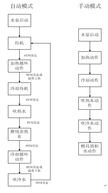 設(shè)備介紹: 該模溫機是協(xié)助一OEM客戶開發(fā)的,用于配合注塑機運行。最開始OEM客戶采用傳統(tǒng)的電器設(shè)備控制方式做了一臺樣機,根據(jù)系統(tǒng)要求,控制水泵、水閥及一些報警顯示需要相應(yīng)的一系列開關(guān)和指示燈,還需大量各種繼電器,接線也非常麻煩。樣機的調(diào)試及試用結(jié)果并不理想,于是決定采用PLC來實現(xiàn)設(shè)備的運行控制。很明顯,在能達到系統(tǒng)控制要求的情況下,客戶優(yōu)先選擇了價格便宜的西門子224CPU加上UniMAT的4TC模塊和16DO模塊來實現(xiàn)控制。 控制要求: 1.根據(jù)路溫度反饋或設(shè)定的時間控制熱水或冷水的排送。 2.控制流程分為手動控制和自動控制兩種方式,兩種控制方式不能同時進行,所有動作必須在水泵啟動的情況下完成。 3.通過觸摸屏監(jiān)視和控制設(shè)備的運行情況,有報警顯示。 4.要求能保存幾組設(shè)定好的各時間、溫度參數(shù),并能讀取直接用。  地址分配表: