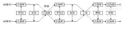一臺加彈假捻機總體控制120根原料絲,分為兩組,其中每組60根絲,工藝框圖如圖1所示。