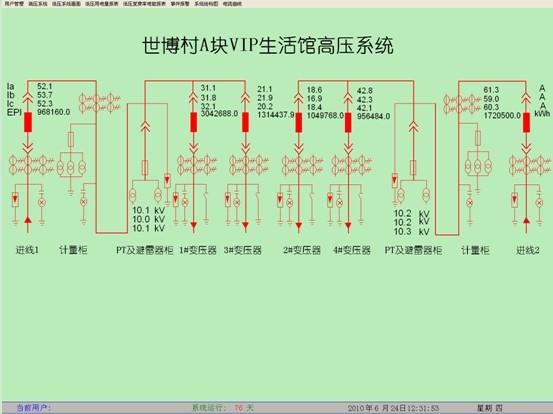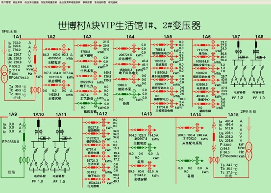 3 案例分析 上海世博村VIP生活館低壓配電系統(tǒng)主要有4臺10kV/0.4kV配電變壓器,本系統(tǒng)主要負責(zé)對低壓進線及相應(yīng)配出回路的實時動態(tài)監(jiān)控以及樓層所安裝電力儀表的回路進行監(jiān)測。 進線回路采用ACR230ELH多功能諧波儀表,其是針對電力系統(tǒng)、工礦企業(yè)、公共設(shè)施、智能大廈的電力監(jiān)控需求而設(shè)計的網(wǎng)絡(luò)電力儀表,它能測量所有常規(guī)電力參數(shù),如:三相電壓、電流、有功功率、無功功率、功率因數(shù)、頻率、有功電度、無功電度、并可監(jiān)測電壓、電流的2-31次諧波分量等多種電參量。并且本儀表帶有4路光電隔離開關(guān)量輸入接點和2路繼電器控制輸出接點,這些接點可以配合智能斷路器實現(xiàn)斷路器的遙信、遙控操作。該系列網(wǎng)絡(luò)電力儀表主要應(yīng)用于變電站自動化、配電網(wǎng)自動化、小區(qū)電力監(jiān)控、工業(yè)自動化、能源管理系統(tǒng)及智能建筑等領(lǐng)域。 重要配出回路采用ACR220EFLK系列網(wǎng)絡(luò)電力儀表,該儀表主要完成三相電流、三相電壓、有功電度的測量、復(fù)費率電能的計量以及開關(guān)信號的檢測和繼電器遙控輸出。 高壓側(cè)實時畫面見圖1,為系統(tǒng)主監(jiān)控畫面,主要實時監(jiān)測高壓回路的運行狀態(tài),紅色代表合閘,綠色代表分閘。