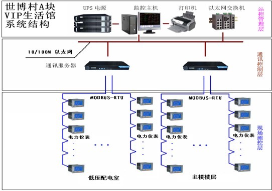 1 電能管理需求分析及系統(tǒng)構(gòu)成 由于該項目是五星級酒店,現(xiàn)場需要監(jiān)測所有安裝智能儀表的回路,并且需對空調(diào)、照明、動力用電進行分類統(tǒng)計,并且該統(tǒng)計報表需每天自動生成,現(xiàn)場設(shè)備運行狀態(tài)包括回路合分閘狀態(tài)也需實時顯示。現(xiàn)場儀表眾多,采用了3個串口服務(wù)器加交換機的組網(wǎng)方式。 本系統(tǒng)采用分層分布式計算機網(wǎng)絡(luò)結(jié)構(gòu): 即間隔層、通訊層和站控層如下圖所示: