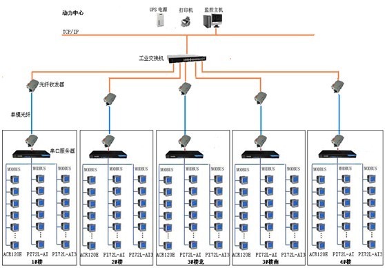 整個系統采用網絡分布式結構,監控主機位于2#樓前面地下一層的動力中心中,其他5個配電室分別位于1#、2#、3#、4#地下一層(其中3#有南北兩個配電室)。該項目實現了淄博運動員公寓4個樓內電力系統的智能管理。設計方案為4個樓內的5個配電室,通過光電轉換器經過光纖拉倒2#樓前面地下一層的動力中心。5個配電室現場放置通訊機柜,儀表數據通過485接口,MODBUS通訊協議經光電轉換器輸送到動力中心。