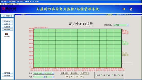 該系統實施后,實現了各類用電設備的一次系統圖顯示、各回路實時電參量遙測、重要回路電能報表、以及進線回路的負荷用電趨勢、重要回路的分合閘報警、用戶權限管理等功能,圖表分別見圖2、3、4、5、6、7。