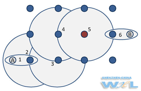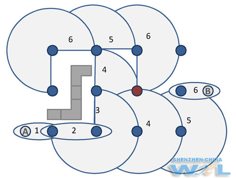 圖5顯示星型網絡與傳統網狀網絡均不適用的照明系統。其中信號需要長距離傳輸至能夠回報電力中斷的節點。不同于ZigBee在大范圍的區域內傳播信息,這里的信息須要朝適當的方向線性傳輸。