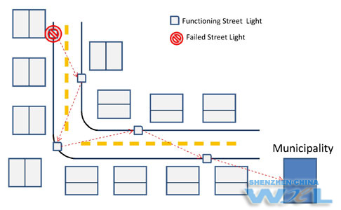 圖5顯示停止作用的電燈。信息需要中繼至集中裝置傳送給技術人員,這是透過其它電燈的一系列點對點信號,將信號從未運作的電燈地址傳送至集中裝置的地址。如果電燈是透過線路供電,無線射頻能夠持續處于接收模式,以等候信息中繼。在持續接收的情況下,信息的延遲程度相對較短,每個躍進為數百毫秒。如果電燈是以太陽能供電,則電源顯得較為重要,可將裝置設定為定時接收模式。定時接收需要與另一個節點的傳輸進行同步處理,因此較為復雜。另外,計算信息躍進之間的時間須要考慮輪詢周期。