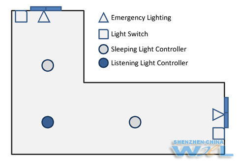 圖4顯示會議室的照明系統,其中有多個天花板照明燈持續點亮。另外,這個房間的出口處設有緊急照明系統,這些照明燈也是持續點亮,如果發生緊急狀況,在電力中斷的情況下,系統會以低電量盡可能維持緊急照明,而且電源開關是可攜式,耗電量相當低,一般會在1小時內與系統互動一兩次。其中所有裝置均在相互影響的范圍內,因此只需要一個裝置主動接收,其裝置可輪詢或進入睡眠狀態。透過所有裝置透過作用中節點進行通訊的星型網絡拓撲,就能夠完成此功能。如此的配置能夠使電源開關及緊急照明達到顯著的節能效果,而且睡眠中節點的響應時間會因為輪詢周期而增加。另外,ZigBee也可用于此系統中,由叢集樹狀向網絡發出信標,以便睡眠中節點在定義的存取時間處理優先級信息,這使得ZigBee網絡能夠關閉下層裝置的電源,同時定時檢查警報或照明層級變更要求。