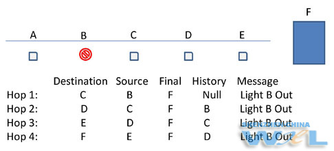 節點B將點對點信息傳送給節點C,而將“電燈關閉”信息回報給節點F。節點C取得信息時,由于沒有任何歷程記錄,因此得知信息來自節點B,而且信息預定傳送至節點F。此時,節點C也得知信息傳輸的方向,信息是從節點B傳來,須要傳送至節點D。在第二次躍進中,節點C將信息傳送至節點D,并且將節點B列入封包的歷程記錄中,以告知節點D應朝什么方向傳輸信息。經過兩次躍進后,信息最終傳遞至節點F(圖6)。