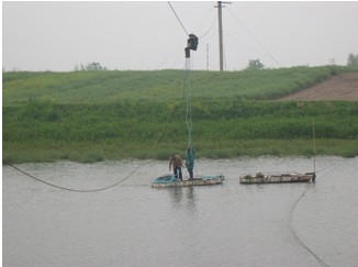 在河溶水文站進行超聲波流量計的現場安裝,主機用ADM7407,用IP68的防水探頭,他們自己還做了個架子,要把兩對探頭分別固定在兩個船上,把電纜吊在上面的鋼纜上,然后通過鋼纜把電纜引到岸上,然后通過地埋電纜引到他們的房子里,因為和開始方案不同,開始是想兩個探頭的電纜分別是150米和100米,在這個位置弄個箱子,然后再用RS232把數據采集回住處,但現在又考慮到雷擊、232轉485不好轉的問題,所以想把信號線加長,直接引到住處里,把探頭安裝好后,進行了測量,把延長電纜加長后,信號非常強,測量情況非常好。因為河流在汛期水草會非常多,把探頭弄成可以上下移動的桿,使用起來也非常方便。