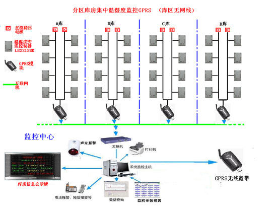 分區(qū)庫房集中溫濕度監(jiān)控GPRS方案(庫區(qū)無網(wǎng)線) |