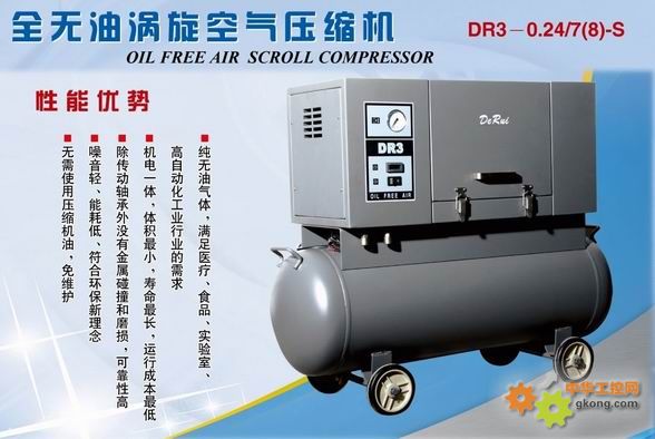 德國獨資的臺州市德瑞壓縮機有限公司引進的DR3系列渦旋式空氣壓縮機,齒頂密封摩擦副采用聚醚醚酮(PEEK)基復合材料,機加工工藝采用德國DMG公司的高精度五軸聯動加工中心(機器加工精度5um),生產的渦旋式空氣壓縮機機頭一直返銷德國,現德方追加投資的DR3系列靜音式渦旋式空氣壓縮機整機生產線,即將全面投產,將極大地滿足國內無油空壓機的需求。