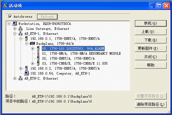 選擇AB_ETH-1,Ethernet中的CPU模塊,點擊 按鈕,聯機。