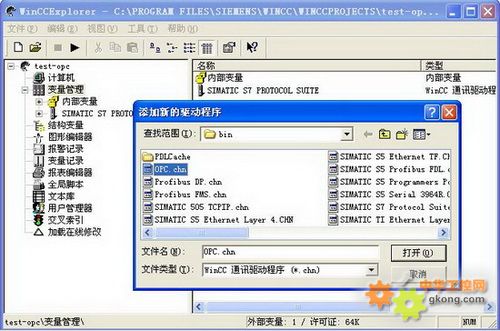 1、打開Wincc軟件,新建一個項目;右鍵“變量管理”,選擇“添加新的驅動程序”,選擇“OPC.chn”