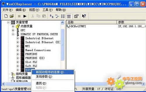 1、新建WINCC項目,選中項目的變量管理,點擊鼠標右鍵,選擇快捷菜單“添加新的驅動程序”,在彈出的對話框中選擇 SIMATIC S7 PROTOCOL SUITE,選擇TCP/IP,點擊鼠標右鍵,新驅動程序的鏈接。
