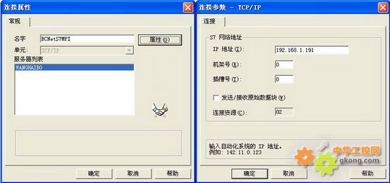 2、在彈出的連接屬性對話框輸入連接名字,如”BCNetS7MPI”,點擊屬性按鈕,在彈出的屬性對話框中輸入IP地址為BCNet-S7MPI的IP地址。