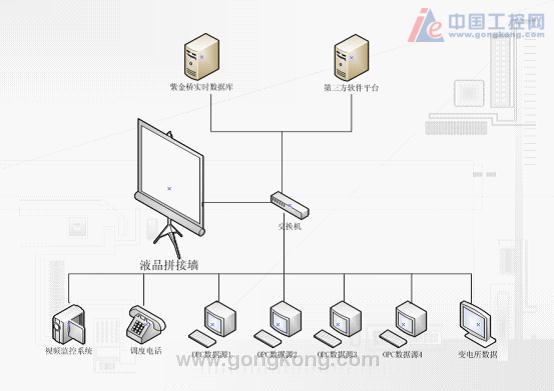在本系統中,紫金橋實時數據庫將現場的多個OPC數據源以及變電所的電力數據通過以太網的形式采集過來,然后進行數據的壓縮保存、同時對生產工藝的流程圖進行動畫的演示,再接下來將處理過后的畫面通過IIS的方式發布出去,最后由第三方軟件平臺將紫金橋實時數據庫發布的數據與視頻監控系統等一起整合,投放到液晶大屏上。