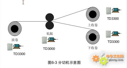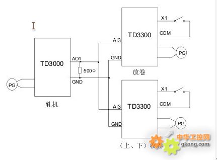TD3000變頻器驅動軋機,控制整個系統的運行速度,AO1設為最大運行頻率對應20mA模擬輸出,在AO1-GND之間接500歐姆電阻,可以將輸出的20mA電流信號轉換成10V的電壓信號。放卷電機、上下收卷點擊均采用TD3300控制,均工作在張力開環控制模式,卷徑計算采用線速度計算法,線速度由軋機變頻器TD3000的AO1輸出獲得,設置一個合理的最低線速度參數。開關量輸入端子X1設為卷徑復位功能,換卷時須進行卷徑復位。通過設置慣量補償系數,可以獲得較好的控制效果。卷徑計算也可以采用厚度積分法、計圈信號直接用PG反饋即可