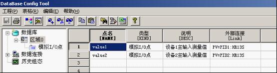 雙擊數據庫選項卡的點組態項,進入點組態環境。建立所需要采集的點,并進行與設備的驅動連接。