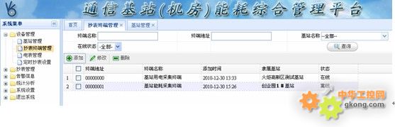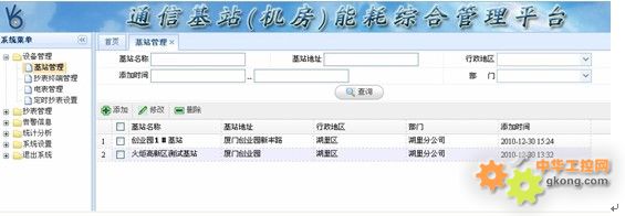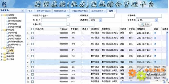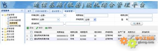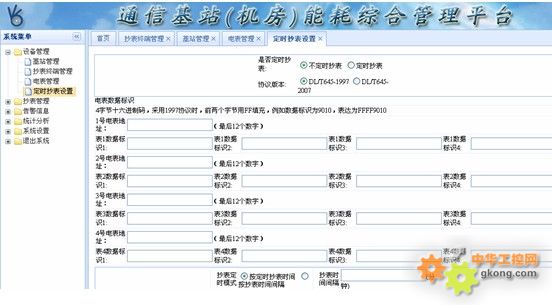 (系統登錄平臺) 2、設備管理 (1)基站信管理包括:基站名稱、基站地址、行政地區、部門、基站添加時間等信息管理。  (基站管理) (2)抄表終端管理包括:終端地址、終端名稱、終端添加時間、隸屬基站、終端狀態等信息管理。  (抄表終端管理) (3)電表管理包括:終端名稱、電表地址、電表名稱、電表型號、電價單價、供電類型、生產廠家、電表協議、電表添加時間等信息管理。  (電表管理) (4)定時抄表設置:1個終端可以同時連接4臺電表,可對每臺電表的4個電表參數進行整點存儲并可設置整點存儲時間,即使遇到網絡故障也能保證數據不丟失。  (定時抄表設置) 3、抄表管理 電表數據:可以按照時間段查詢任意基站下終端,任意終端下電表的所有定時電表參數,方便基站管理人員對各時段用電量進行檢測。  (電表數據) 4、告警 頁面按時間顯示所有終端告警信息:包括終端地址、告警編號、通道類別、當前值、正常值、告警時間、閱讀狀態、閱讀人員等信息,方便基站人員及時準確的處理機房故障。  (告警信息) 5、統計分析 對基站下終端的電表可按時間(小時、天、月等)和瀏覽方式(圖標、表格、Excel等)直觀的顯示出來方便基站管理人員統計分析。  (用電統計) 6、系統設置 系統可對行政區域、公司管理、部門管理、職位設置、角色管理、工號管理等進行設置,設置不同等級的工號和密碼,以限制不同人員的操作范圍。  (系統設置)