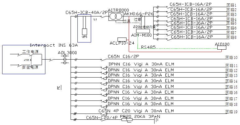 根據(jù)床位的多少來設置變壓器的容量和隔離電源系統(tǒng)的套數(shù)。在每條饋出回路中也增加了C65H型斷路器,可以起到帶短路保護不帶過載保護的功能。