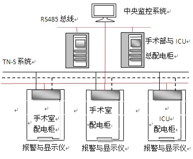 采用IT系統(tǒng)的潔凈手術室和ICU/CCU重癥監(jiān)護室都需要有獨立的隔離電源系統(tǒng)。醫(yī)療場所采用圖4的配電方式:從圖中可以看出各個手術室和重癥監(jiān)護室采用手術部與ICU總配電柜進行供電。各配電柜通過基于Modbus協(xié)議的RS485總線把系統(tǒng)的監(jiān)測信息傳輸給醫(yī)院的中央監(jiān)控系統(tǒng),這樣每個2類場所的系統(tǒng)運行數(shù)據(jù)都可以在中央監(jiān)控系統(tǒng)的上位機軟件進行實時的處理。方便工作人員對監(jiān)控系統(tǒng)進行集中監(jiān)控和管理。