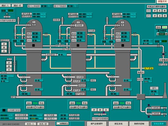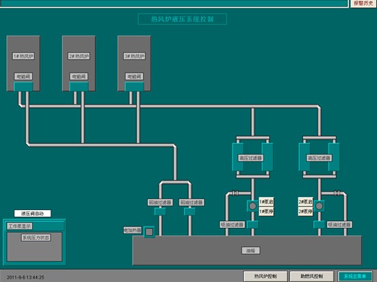 3、熱風爐畫面 此畫面中可實現助燃風機、調壓閥組、助燃調節閥、混風閥、冷風閥、熱風閥、放散閥、冷風均壓閥、煤氣調節閥、空氣調節閥、空氣切斷閥、煤氣切斷閥各種工藝閥門的操作并顯示儀表參數。能自動完成熱風爐的各階段轉換達到自動送風、燜爐 、燒爐。各種閥門在畫面中可實現點動操作,調節閥各通過輸入預定數值或點擊滾動條自動調節。 圖四