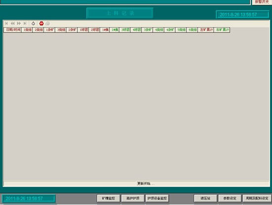 七、畫面介紹 畫面系統是操作人員與控制系統的人機界面,操作人員通過畫面對設備進行操作、監視設備的運行情況,及時做出相應調整,畫面系統可以設定數據,改變運行方式,向操作人員顯示設備的正常狀態及報警信息等。 CRT畫面顯示主要內容如下: (1)系統畫面:熱風、布袋、礦槽、爐頂、本體儀表、爐長操爐、爐頂儀表等 (2)控制設定畫面:配料、爐頂溜槽角度、料流開度參數設定 (3)故障監視畫面:實時顯示故障信號提示操作人員進行相應措施 (4)報警記錄:記錄各設備及儀表的故障報警 (5)報表記錄:對生產參數進行實時記錄 以下就主要畫面進行介紹 1、上料畫面: 包括整個卷楊及爐頂設備,其中主要有上料小車、左右探尺、柱塞閥、上密、下密、旋轉布料裝置、均壓閥、放散閥等。生產中可實現手動、自動隨時轉換,各種運行、故障有不同的顏色來顯示,特點1、小車拐點、卸料位等各減速點停車位可根據生產調節2、旋轉布料角度及速度可通過畫面直接設定,滿足生產工藝中的各種布料方式3、在檢修或新員工培訓情況下還可以通過畫面各種數據的設定來進行模擬生產。 圖二