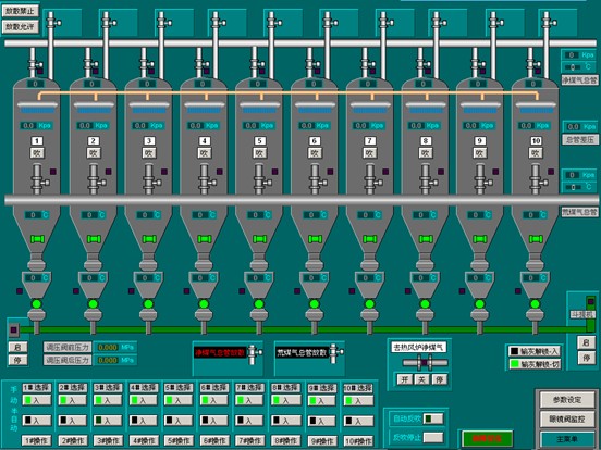4、布袋除塵畫面 包括脈沖閥、上下卸灰閥、放散閥、上炮、下炮、輸灰機、斗提機、進出口蝶閥和進出口盲板閥,并顯示設備運行狀態、各儀表參數等。用鼠標點擊各閥們可自動彈出控制菜單,脈沖閥為動態顯示,可隨時發現因頻繁動作而損壞的電磁閥。脈沖時間及箱體選擇可根據要求設定。 在自動情況下自動完成吹掃,根據設定從1#開始依次至8號箱體。如果某個箱體出現問題會自動跳過該箱體向下執行。 圖五