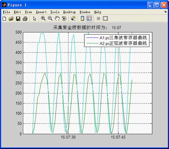 下圖是MATLAB采集紫金橋軟件的實時數據,并進行實時繪制的二條曲線。