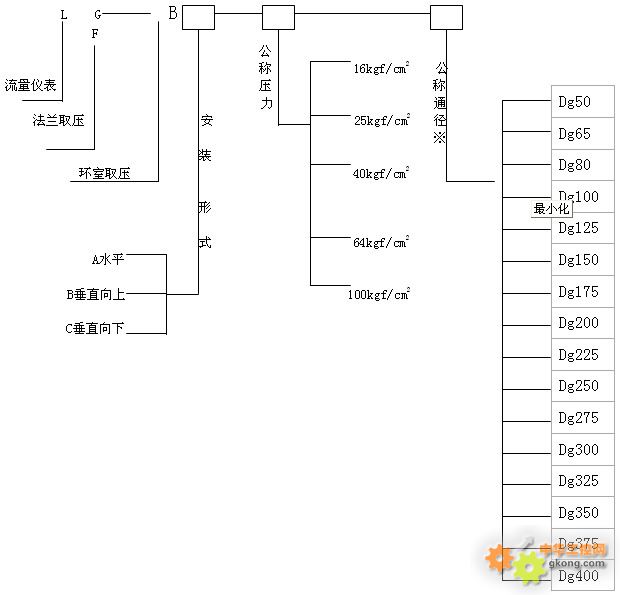 例:LGBA—16—80表示:標(biāo)凈環(huán)室孔板節(jié)流裝置,水平安裝,工作壓力6kgf/cm2