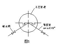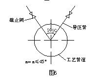 2) 被測流體為氣體時,為防止液體(冷凝液)進(jìn)入導(dǎo)壓管,取壓口應(yīng)處工藝管道中心管道上方線上偏≤45°的位置上,正負(fù)取壓口處于與管道對稱位置時,兩者應(yīng)在同一水平線上。(見圖6)