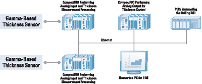 每個(gè)軋制機(jī)器都帶有三個(gè)形成網(wǎng)絡(luò)的CompactRIO系統(tǒng)。這三個(gè)系統(tǒng)都是智能節(jié)點(diǎn),能利用一個(gè)工業(yè)標(biāo)準(zhǔn)Modbus/TCP、TCP/IP或UDP協(xié)議進(jìn)行通信。其中有兩個(gè)系統(tǒng)與伽馬級(jí)傳感器連接,并進(jìn)行模擬輸入測(cè)量和高級(jí)處理,來(lái)計(jì)算精確厚度測(cè)量值。