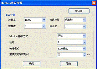 所有參數設置的內容都可以從下拉菜單中選擇。在“MODBUS 協議參數”界面的右上角有個“默認值”按鈕,默認值是 MODBUS 協議推薦的通訊設置。