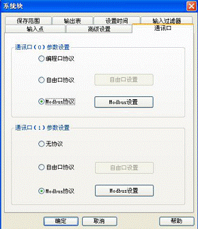 - 設置系統塊中的通信口,在這里有兩個可選的通信口:通信口0和通信口 1。通信口 0 只支持 MODBUS 從站;通信口 1 既支持MODBUS 主站也支持從站。以設置通信口 1為例,選中“通訊口(1)參數設置”中的 “MODBUS 協議”,點擊“MODBUS 設置”按鈕,彈出MODBUS 協議參數設置界面,如下圖。
