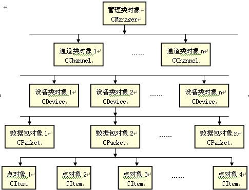 每一個調度程序都會創建唯一的管理類(CManager)對象來管理著所有的其他對象,該對象同時管理著一系列的通道對象。所謂的通道(CChannel)對象其實是一系列的通訊介質的抽象,比如一個串口就可以抽象為一個通道對象,再比如一個網絡的端口也可以抽象成一個通道對象。調度程序的通道對象隱藏了各種通訊介質的差別,驅動編制者可以不用關心通道的具體細節。在每一個通道對象的內部又管理著若干的設備(CDevice)對象。這種關系可以這樣來理解,比如我們在計算機的Com1口上通過Rs485總線聯結了3臺設備,在Com2口上聯結了一臺設備。那么調度程序在運行時就會首先創建一個CManager對象,然后再創建兩個CChannel對象讓CManager對象來管理,它們分別對應Com1和Com2口。然后在Com1對象內創建三個CDevice對象和三臺設備相對應,在Com2對象內創建1個CDevice對象。在CDevice的下一級是包對象(CPacket),設備采集數據的時候總是以包為單位進行采集。在包對象的內部又包含著若干的點(CItem),一個點對應著一個從實時數據庫位號到實際設備的連接,從設備中采集到的數據首先被放到點中,然后才送入實時數據庫中去的。