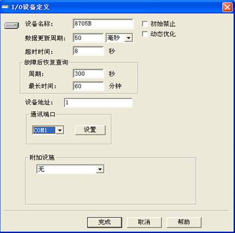 可以看到在此對話框中需要我們輸入設備名稱,調度程序就是使用設備名稱來得到設備配置的。同時還可以看到在此對話框中需要我們輸入設備地址,選擇并配置通訊端口。此對話框由紫金橋系統提供,是一個缺省的定義設備的對話框。一些簡單的設備,使用缺省的設備定義對話框即可完成定義,而一些復雜的設備就必須要求驅動程序提供進一步的設備定義。