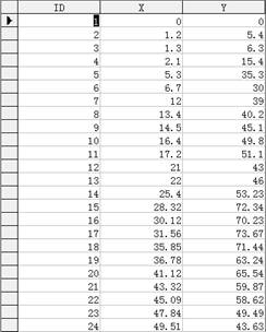 我們的示例Access庫的名字是CurveData.mdb,已經(jīng)復(fù)制到了工程目錄下面的SQL中(復(fù)制到工程目錄下的好處是即使更改了工程目錄的位置,甚至更改了工程目錄的名字,仍然無需更改工程本身就可以連接該Access庫),在這個(gè)Access數(shù)據(jù)庫中有一個(gè)數(shù)據(jù)表名Data,它的內(nèi)容如下所示: